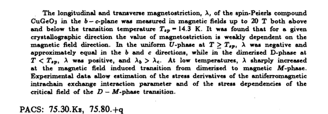 The longitudinal and transverse magnetostriction, λ, of the spin-Peierls compound CuGe03 in the ø — Å-plane was measured in magnetic fields up to 20 Τ both above and below the transition temperature T,p -14.3 K. It was found that for a given crystallographic direction the value of magnetostriction is weakly dependent on the magnetic field direction. In the uniform [/-phase at Τ > T,p, λ was negative and approximately equal in the b and Ó directions, while in the dimeriEed D-phase at Τ < ôÇÒ, λ was positive, and ìØ > ìÓ. At low temperatures, λ sharply increased at the magnetic field induced transition from dimerized to magnetic Μ-phase. Experimental data allow estimation of the stress derivatives of the antiferromagnetic intrachain exchange interaction parameter and of the stress dependencies of the critical field of the D — Af-phase transition. PACS: 75.30.Kz, 75.80.+q