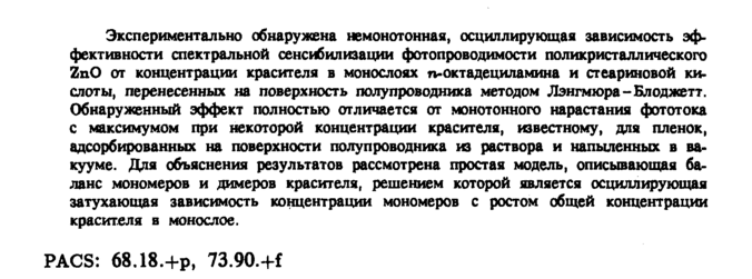 Экспериментально обнаружена немонотонная, осциллирующая зависимость эффективности спектральной сенсибилизации фотопроводимости поликристаллического ZnO от концентрации красителя в монослоях n-октадециламина и стеариновой кислоты, перенесенных на поверхность полупроводника методом Лэнгмюра Блоджетт. Обнаруженный эффект полностью отличается от монотонного нарастания фототока с максимумом при некоторой концентрации красителя, известному, для пленок, адсорбированных на поверхности полупроводника из раствора и напыленных в вакууме. Для объяснения результатов рассмотрена простая модель, описывающая баланс мономеров и димеров красителя, решением которой является осциллирующая затухающая зависимость концентрации мономеров с ростом общей концентрации красителя в монослое. PACS: 68.18.+Р, 73.90.+f