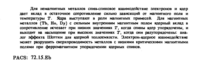 Для немагнитных металлов спин-спиновое взаимодействие электронов и ядер дает вклад в остаточное сопротивление сильно зависящий от магнитного поля и температуры Т. Ядра выступают в роли магнитных примесей. Для магнитных металлов (ТЬ, Но, Dy) с сильным внутренним магнитным полем ядерный вклад в сопротивление исчезает при низких значениях Г, когда спины ядер упорядочены, и выходит на насыщение при высоких значениях Т, когда они разупорядочены: аналог эффекта Шоттки для ядерной теплоемкости. Электрон-ядерное взаимодействие может разрушить сверхпроводимость металлов с низкими критическими магнитными полями при ферромагнитном упорядочении ядерных спинов. PACS: 72.15.Eb