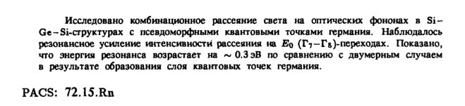 Исследовано комбинационное рассеяние света на оптических фононах в Si-Ge-Si-структурах с псевдоморфными квантовыми точками германия. Наблюдалось резонансное усиление интенсивности рассеяния на £>о (Гт—Г&)-переходах. Показано, что энергия резонанса возрастает на ~ 0.3 эВ по сравнению с двумерным случаем в результате образования слоя квантовых точек германия. PACS: 72.15.Rn