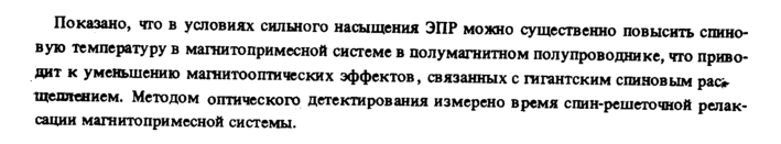 Показано, что в условиях сильного насыщения ЭПР можно существенно повысить спиновую температуру в магнитопримесной системе в полумагнитном полупроводнике, что приводит к уменьшению магнитооптических эффектов, связанных с гигантским спиновым рас* шеплснием. Методом оптического детектирования измерено время спин-решеточной релаксации магнитопримесной системы.