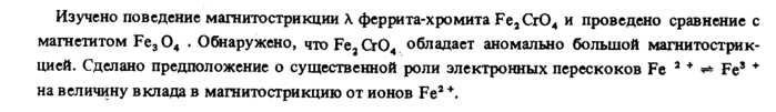 Изучено поведение магнитострикции λ феррита-хромита FeaCr04 и проведено сравнение с магнетитом Fe3 04 . Обнаружено, что Fe* Сг04 обладает аномально большой магнитострик-цией. Сделано предположение о существенной роли электронных перескоков Fe * + Fes + на величину вклада в магнитострикцию от ионов Fe2 +.