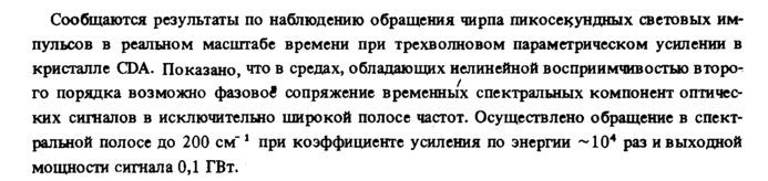 Сообщаются результаты по наблюдению обращения чирпа пикосекундных световых импульсов в реальном масштабе времени при трехволновом параметрическом усилении в кристалле CD А. Показано, что в средах, обладающих нелинейной восприимчивостью второго порядка возможно фазовов сопряжение временных спектральных компонент оптических сигналов в исключительно широкой полосе частот. Осуществлено обращение в спектральной полосе до 200 см-1 при коэффициенте усиления по энергии ~104 раз и выходной мощности сигнала 0,1 ГВт.