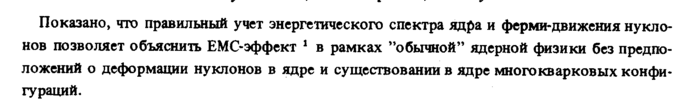Показано, что правильный учет энергетического спектра ядра и ферми-движения нуклонов позволяет объяснить ЕМОэффект 1 в рамках "обычной" ядерной физики без предположений о деформации нуклонов в ядре и существовании в ядре много кварков ых конфигураций.