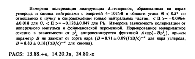 Измерена поляризация лидирующих А-гиперонов, образованных на ядрах углерода и свинца нейтронами с энергией 4-10ГэВ в области углов Θ < 8.5° по отношению к пучку в сопровождении только нейтральных частиц: < Π >—0.096± ±0.018 для С, < Π >-0.128±0.047 для РЬ. Измерена зависимость поляризации от поперечного импульса и фейнмановской переменной. Нормированное инвариантное сечение в зависимости от р2± аппроксимируется функцией Аехр(-Вр^), причем параметр В не зависит от сорта ядра {В -8.71 ±0.09(ГэВ/с)~2 для ядра углерода, В~8.83±0.18(ГэВ/с)-2 для свинца). PACS: 13.88.-he, 14.20.Jn, 24.80.-х
