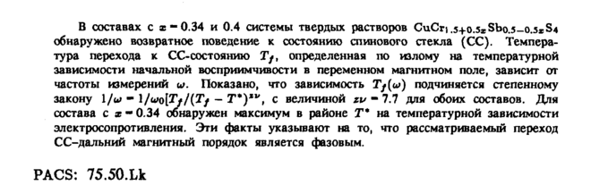 В составах с χ-0.34 и 0.4 системы твердых растворов CuCr1.54-o.5xSbo.5-o.jxS4 обнаружено возвратное поведение к состоянию спинового стекла (СС). Температура перехода к СС-состоянию Т/, определенная по излому на температурной зависимости начальной восприимчивости в переменном магнитном поле, зависит от частоты измерений ω. Показано, что зависимость Т/{ш) подчиняется степенному закону 1/« 1/о;о[2//(2/ Т*)*", с величиной zv 7.7 для обоих составов. Для состава с χ 0.34 обнаружен максимум в районе Г* на температурной зависимости электросопротивления. Эти факты указывают на то, что рассматриваемый переход СС-дальний магнитный порядок является фазовым. PACS: 75.50.Lk