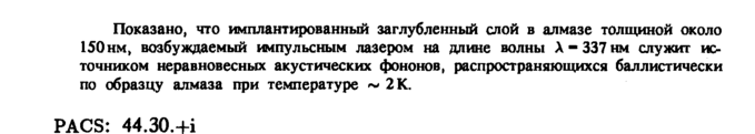 Показано, что имплантированный заглубленный слой в алмазе толщиной около 150 нм, возбуждаемый импульсным лазером на длине волны λ-337 им служит источником неравновесных акустических фононов, распространяющихся баллистически по образцу алмаза при температуре ~ 2 К. PACS: 44.30.+Ϊ