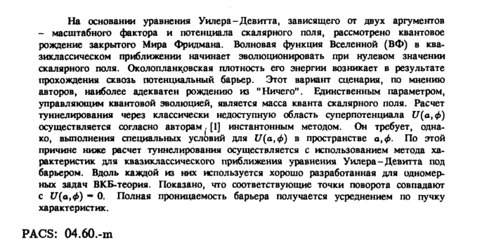 ![<b>На основании уравнения Уилера-Девитта, зависящего от двух аргументов масштабного фактора и потенциала скалярного поля, рассмотрено квантовое рождение закрытого Мира Фридмана. Волновая функция Вселенной (ВФ) в квазиклассическом приближении начинает эволюционировать при нулевом значении скалярного поля. Околопланкрвская плотность его энергии возникает в результате прохождения сквозь потенциальный барьер. Этот вариант сценария, по мнению авторов, наиболее адекватен рождению из "Ничего". Единственным параметром, управляющим квантовой эволюцией, является масса кванта скалярного поля. Расчет туннелирования через классически недоступную область суперпотенциала </b><i>и<b>{а</b>,ф) </i><b>осуществляется согласно авторам, [1] инстантонным методом. Он требует, однако, выполнения специальных условий для </b><i>и<b>{а</b>,ф) </i><b>в пространстве <i>а</i></b><i>,ф. </i><b>По этой причине ниже расчет туннелирования осуществляется с использованием метода характеристик для квазиклассического приближения уравнения Уилера-Девитта под барьером. Вдоль каждой из них используется хорошо разработанная для одномерных задач ВКБ-теория. Показано, что соответствующие точки поворота совпадают с </b><i>и<b>(а</b>,ф) </i><b>0. Полная проницаемость барьера получается усреднением по пучку характеристик.</b> <b>PACS: </b><a href="http://04.60.-m"><b>04.60.-m</b></a>](/ps/981/article_14942_800_head.png)