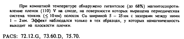 При комнатной температуре обнаружено гигантское (до 68%) магнитосопроти-вление пленок (ПО) V на слюде, на поверхности которых выращена периодическая система тонких (< 10нм) полосок Со шириной 5 25 нм с зазорами между ними 1 — 2нм. Эффект наблюдался только в тех образцах, у которых намагниченность выходит из плоскости пленки. PACS: 72.12.G, 73.60.D, 75.70.