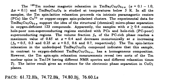 The ,69Tm nuclear magnetic relaxation in ôÔ÷Á2óÉÚïÂ+1 (χ 0.1 1.0, Δζ 0.1) and ôÔ÷ÁÇóÇÉï× is studied at temperatures below 5 K. In all the samples, the Tm spin-lattice relaxation proceeds via intrinsic paramagnetic centers (PCs) like Cu2+ or copper-oxygen spin-polarized clusters. The experimental data for ôÔ÷ÁÇóÉÚïÂ+È support the idea of the structural (chemical) micro-phase separation in oxygen-deficient 123 compounds. Apparently, the samples with χ > 0.4 contain hole-poor non-superconducting regions enriched with PCs and hole-rich (PC-poor) superconducting regions. The volume fraction /„ of the PC-rich phase reaches a maximum value of 0.85 at χ — 0.4 and decreases monotonically at χ increasing (fn ~ 0.5, 0.3 and 0.25 at χ 0.5, 0.6 and 0.7, respectively). The Tm spin-lattice relaxation in the underdoped ôÔ÷ÁÇó^ï× compound indicates that this sample, in contrast to oxygen-deficient ôÔ÷ÁÇóÉÚïÂÃ-È, has a homogeneous composition. However, the Tm spin-spin relaxation measurements reveal two sorts of the Tm nuclear spins in Tml24 having different NMR spectra and different relaxation times ôÇThe latter result gives an evidence for the electronic phase separation in óÉïÇ planes. PACS: 61.72.Hh, 74.72.Bk, 74.80.Bj, 76.60.Lz