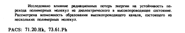 Исследовано влияние радиационных потерь энергии на устойчивость перехода полимерных молекул из диэлектрического в высокопроводящее состояние. Рассмотрена возможность образования высокопроводящего канала, состоящего из нескольких полимерных молекул. PACS: 71.20.Hk, 73.61.Ph