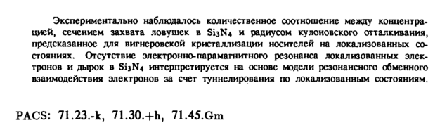 Экспериментально наблюдалось количественное соотношение между концентрацией, сечением захвата ловушек в S13N4 и радиусом кулоновского отталкивания, предсказанное для вигнеровской кристаллизации носителей на локализованных состояниях. Отсутствие электронно-парамагнитного резонанса локализованных электронов и дырок в S13N4 интерпретируется на основе модели резонансного обменного взаимодействия электронов за счет туннелирования по локализованным состояниям. PACS: 71.23.-k, 71.30.-l-h, 71.45.Gm