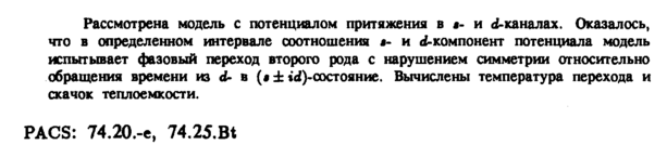 Рассмотрена модель с потенциалом притяжения в »и <ί-каналах. Оказалось, что в определенном интервале соотношения «и <ί-компонент потенциала модель испытывает фазовый переход второго рода с нарушением симметрии относительно обращения времени из dв (»± »<*)-состояние. Вычислены температура перехода и скачок теплоемкости. PACS: 74.20.-е, 74.25.Bt