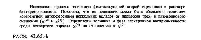 Исследован процесс генерации фемтосекундной второй гармоники в растворе бактериородопсина. Показано, что ее поведение может быть объяснено наличием когерентной интерференции нескольких вкладов от процессов трехи пятиволнового смешения (χ(2) и χ^4^). Определены величина и фаза электронной восприимчивости среды четвертого порядка χ(4) по отношению к χ(2). PACS: 42.65.-k