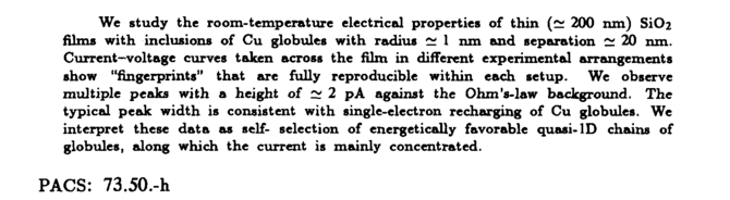 We study the гоom-temperature electrical properties of thin (~ 200 nm) S1O2 films with inclusions of Cu globules with radius ~ 1 nm and separation ~ 20 nm. Current-voltage curves taken across the film in different experimental arrangements show "fingerprints" that are fully reproducible within each setup. We observe multiple peaks with a height of ~ 2 pA against the Ohm's-law background. The typical peak width is consistent with single-electron recharging of Cu globules. We interpret these data as selfselection of energetically favorable quasi-ID chains of globules, along which the current is mainly concentrated. PACS: 73.50.-h