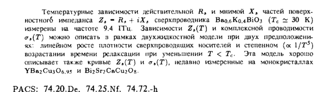 Температурные зависимости действительной Я, и мнимой X, частей поверх-ностногб импеданса Z, R, + гХ, сверхпроводника Вао.бКо.4ВЮз (Тс ~ 30 К) измерены на частоте 9.4 ГГц. Зависимости Z,(T) и комплексной проводимости σ,(Τ) можно описать в рамках двухжидкостной модели при двух предположениях: линейном росте плотности сверхпроводящих носителей и степенном (ос 1/Т5) возрастании времени релаксации при уменьшении Г < Тс. Эта модель хорошо описывает также кривые Ζ,(Τ) и σ,(Τ), недавно измеренные на монокристаллах УВа2Сиз06.95 и Bi2Sr2CaCu208. PACS: 74.20.De. 74.25.Nf. 74.72.-h