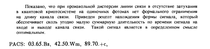 Показано, что при произвольной дисперсии линии связи в отсутствие затухания в квантовой криптосистеме на одиночных фотонах нет формального ограничения на длину канала связи. Приведен рецепт нахождения формы сигнала, который обеспечивает сколь угодно малую суммарную длительность по времени сигнала на входе и выходе канала связи. Такой сигнал является в определенном смысле оптимальным. PACS: 03.65.Bz, 42.50.Wm, 89.70,+с,