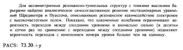 Для несимметричных резонансно-туннельных структур с тонкими высокими барьерами найдено аналитическое самосогласованное решение нестационарных уравнений Шредингера и Пуассона, описывающих резонансное взаимодействие электронов с высокочастотным полем. Показано, что плазменные колебания ограничивают вероятность переходов между соседними уровнями и аномально сильно (в десятки и сотни раз по сравнению с переходами между соседними уровнями) подавляют вероятность переходов с изменением номера уровня больше чем на единицу. PACS: 73.30,+у