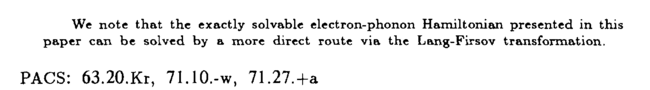 We note that the exactly solvable electron-phonon Hamiltonian presented in this paper can be solved by a more direct route via the Lang-Firsov transformation. PACS: 63.20.Kr, 71.10.-w, 71.27.+a