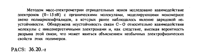 Методом масс-шектрометрии отрицательных ионов исследовано взаимодействие электронов (0-15эВ) с органическими молекулами, моделирующими мономерное звено полиариленфталидов, в которых ранее наблюдалось явление зарядовой неустойчивости. Обнаружена неустойчивость связи С-О относительно взаимодействия молекулы с никоэнергетичными электронами и, как следствие, высокая вероятность разрыва этой связи, что может явиться объяснением необычных электрофизических свойств этих полимеров. PACS: 36.20.-r