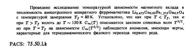 Проведено исследование температурной зависимости магнитного вклада в теплоемкость анизотропного возвратного ферримагнетика Lio.475Coo.osFe1.575Gao.9O4 с температурой замерзания Tf -80К. Установлено, что как при Τ < Г/, так и при Τ > Tf вплоть до Τ ~ 150 К Ст(Т) описывается законом спиновых волн т3/2, но при Τ Tf на зависимости Ст{Тг1г) наблюдается аномалия, имеющая черты, характерные для термодинамического фазового перехода первого рода. PACS: 75.50.Lk