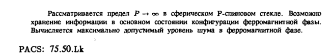 Рассматривается предел Ρ —» оо в сферическом Р-спиновом стекле. Возможно хранение информации в основном состоянии конфигурации ферромагнитной фазы. Вычисляется максимально допустимый уровень шума в ферромагнитной фазе. PACS: 75.50.Lk