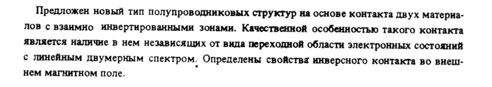 Предложен новый тип полупроводниковых структур на основе контакта двух материалов с взаимно инвертированными зонами. Качественной особенностью такого контакта является наличие в нем независящих от вида переходной области электронных состояний с линейным двумерным спектром. Определены свойства* инверсного контакта во внешнем магнитном поле.