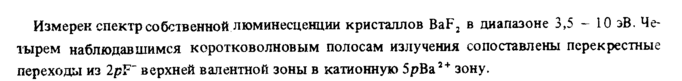 Измерен спектр собственной люминесценции кристаллов BaF2 в диапазоне 3,5-10 эВ. Четырем наблюдавшимся коротковолновым полосам излучения сопоставлены перекрестные переходы из 2рК верхней валентной зоны в катионную 5рВа2+ зону.