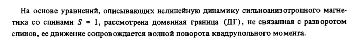На основе уравнений, описывающих нелинейную динамику сильноанизотропного магнетика со спинами 5 = 1, рассмотрена доменная граница (ДГ), не связанная с разворотом спинов, ее движение сопровождается волной поворота квадрупольного момента.