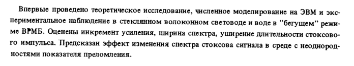 Впервые проведено теоретическое исследование, численное моделирование на ЭВМ и экспериментальное наблюдение в стеклянном волоконном световоде и воде в "бегущем" режиме ВРМБ. Оценены инкремент усиления, ширина спектра, уширение длительности стоксово-го импульса. Предсказан эффект изменения спектра стоксова сигнала в среде с неоднород-ностями показателя преломления.