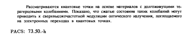 Рассматриваются квантовые точки на основе материалов с долгоживущими те-рагерцовыми колебаниями. Показано, что сжатые состояния таких колебаний могут приводить к сверхвысокочастотной модуляции оптического излучения, поглощаемого на электронных переходах в квантовых точках. PACS: 73.50.-h