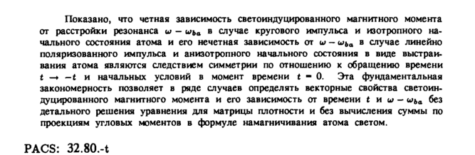 Показано, что четная зависимость светоиндуцированного магнитного момента от расстройки резонанса ω — шьа в случае кругового импульса и изотропного начального состояния атома и его нечетная зависимость от ш — в случае линейно поляризованного импульса и анизотропного начального состояния в виде выстраивания атома являются следствием симметрии по отношению к обращению времени t —» — t и начальных условий в момент времени t 0. Эта фундаментальная закономерность позволяет в ряде случаев определять векторные свойства светоиндуцированного магнитного момента и его зависимость от времени t и ω — оца без детального решения уравнения для матрицы плотности и без вычисления суммы по проекциям угловых моментов в формуле намагничивания атома светом. PACS: 32.80.-t