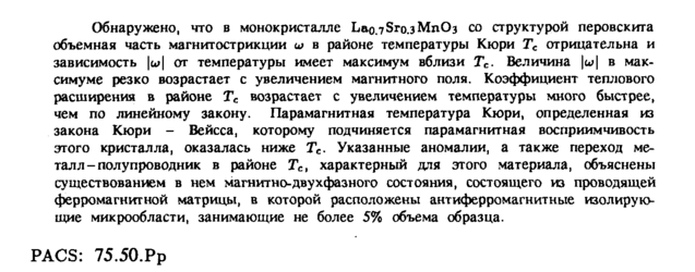 Обнаружено, что в монокристалле ЬволЭго.зМпОз со структурой перовскита объемная часть магнитострикции ш в районе температуры Кюри Тс отрицательна и зависимость |ω| от температуры имеет максимум вблизи Тс. Величина \ω\ в максимуме резко возрастает с увеличением магнитного поля. Коэффициент теплового расширения в районе Тс возрастает с увеличением температуры много быстрее, чем по линейному закону. Парамагнитная температура Кюри, определенная из закона Кюри Вейсса, которому подчиняется парамагнитная восприимчивость этого кристалла, оказалась ниже Тс. Указанные аномалии, а также переход металл-полупроводник в районе Тс, характерный для этого материала, объяснены существованием в нем магнитно-двухфазного состояния, состоящего из проводящей ферромагнитной матрицы, в которой расположены антиферромагнитные изолирующие микрообласти, занимающие не более 5% объема образца. PACS: 75.50.Рр