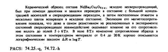 Керамический образец состава ОДВагСщОб+х, исходно несверхпроводящий, был при помощи давления и закалки переведен в состояние с большой концентрацией носителей и сверхпроводящим переходом, а затем постепенным отжигом в несколько шагов возвращен в исходное состояние. Эволюция его магнетосопроти-вления показала, что даже в самом резистивном из реализованных в эксперименте состояний сверхпроводящее взаимодействие оказывает влияние на его сопротивление вплоть до полей 5 бТл. В поле 8Тл изменение сопротивления образца в этом состоянии в температурном интервале от 0.4 до 20 К хорошо описывается логарифмическим законом Δ Л ос log Т. PACS: 74.25.-q, 74.72.-h