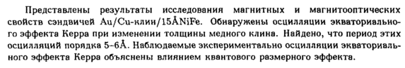 Представлены результаты исследования магнитных и магнитооптических свойств сэндвичей Аи/Си-клин/15А№Ре. Обнаружены осцилляции экваториального эффекта Керра при изменении толщины медного клина. Найдено, что период этих осцилляций порядка 5~бА. Наблюдаемые экспериментально осцилляции экваториального эффекта Керра объяснены влиянием квантового размерного эффекта.