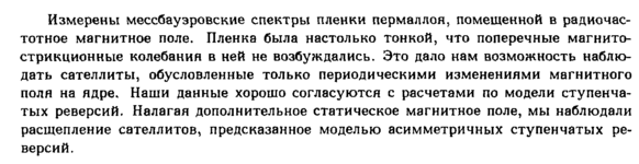 Измерены мессбауэровские спектры пленки пермаллоя, помещенной в радиочастотное магнитное поле. Пленка была настолько тонкой, что поперечные магнито-стрикционные колебания в ней не возбуждались. Это дало нам возможность наблюдать сателлиты, обусловленные только периодическими изменениями магнитного поля на ядре* Наши данные хорошо согласуются с расчетами по модели ступенчатых реверсий. Налагая дополнительное статическое магнитное поле, мы наблюдали расщепление сателлитов, предсказанное моделью асимметричных ступенчатых реверсий.