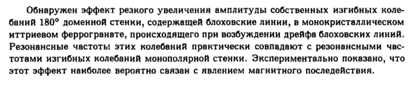 Обнаружен эффект резкого увеличения амплитуды собственных изгибных колебаний 180° доменной стенки, содержащей блоховские линии, в монокристаллическом иттриевом феррогранате, происходящего при возбуждении дрейфа блоховских линий. Резонансные частоты этих колебаний практически совпадают с резонансными частотами изгибных колебаний монополярной стенки. Экспериментально показано, что этот эффект наиболее вероятно связан с явлением магнитного последействия.