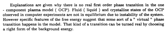Explanations are given why there is no real first order phase transition in the one component plasma model ( OGP). Fluid ( liquid ) and crystalline states of the OCP observed in computer experiments are not in equilibrium due to instability of the system. However specific features of the free energy suggest that some sort of a " virtual " phase transition happens in the model. That kind of a transition can be turned real by choosing a right form of the background energy.