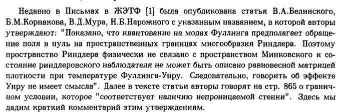 Недавно в Письмах в ЖЭТФ [1] была опубликована статья В.А.Белинского, Б.М.Корнакова, В.Д.Мура, Н.Б.Нарожного с указанным названием, в которой авторы утверждают: "Показано, что квантование на модах Фуллинга предполагает обращение поля в нуль на пространственных границах многообразия Риндлера. Поэтому пространство Риндлера физически не связано с пространством Минковского и состояние риндлеровского наблюдателя не может быть описано равновесной матрицей плотности при температуре Фуллинга-Унру. Следовательно, говорить об эффекте Унру не имеет смысла". Далее в тексте статьи авторы говорят на стр. 865 о граничном условии, которое "соответствует наличию непроницаемой стенки". Здесь мы дадим краткий комментарий этим утверждениям.