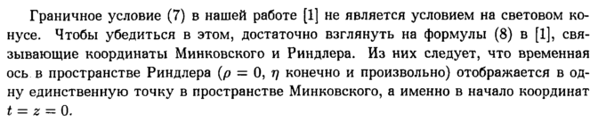 Граничное условие (7) в нашей работе [1] не является условием на световом конусе. Чтобы убедиться в этом, достаточно взглянуть на формулы (8) в [1], связывающие координаты Минковского и Риндлера. Из них следует, что временная ось в пространстве Риндлера (ρ — 0, η конечно и произвольно) отображается в одну единственную точку в пространстве Минковского, а именно в начало координат t = z = 0.