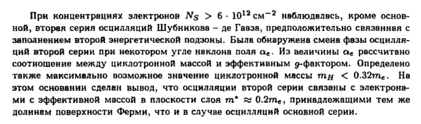 При концентрациях электронов Ν$ > 6* 1012см-2 наблюдалась, кроме основной, вторая серия осцилляции Шубникова де Гааза, предположительно связанная с заполнением второй энергетической подзоны. Была обнаружена смена фазы осцилля-ций второй серии при некотором угле наклона поля ас. Из величины ае рассчитано соотношение между циклотронной массой и эффективным ^-фактором. Определено также максимально возможное значение циклотронной массы тн < 0.32гое. На этом основании сделан вывод, что осцилляции второй серии связаны с электронами с эффективной массой в плоскости слоя т* « 0.2те, принадлежащими тем же долинам поверхности Ферми, что и в случае осцилляций основной серии.