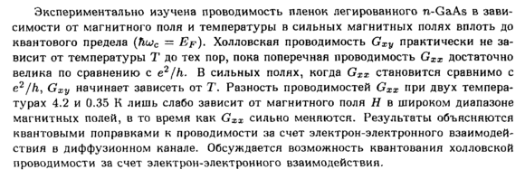Экспериментально изучена проводимость пленок легированного n-GaAs в зависимости от магнитного поля и температуры в сильных магнитных полях вплоть до квантового предела (Ншс = Ер). Холловская проводимость Gxy практически не зависит от температуры Τ до тех пор, пока поперечная проводимость Gxx достаточно велика по сравнению с е2/Л. В сильных полях, когда Gxx становится сравнимо с e2/h, Gxy начинает зависеть от Т. Разность проводимостей Gxx при двух температурах 4.2 и 0.35 К лишь слабо зависит от магнитного поля Η в широком диапазоне магнитных полей, в то время как Gxx сильно меняются. Результаты объясняются квантовыми поправками к проводимости за счет электрон-электронного взаимодействия в диффузионном канале. Обсуждается возможность квантования холловской проводимости за счет электрон-электронного взаимодействия.