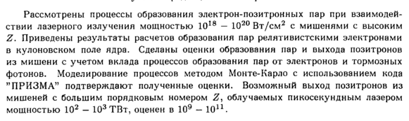 Рассмотрены процессы образования электрон-позитронных пар при взаимодействии лазерного излучения мощностью 1018 — 1020 Вт/см2 с мишенями с высоким Z. Приведены результаты расчетов образования пар релятивистскими электронами в кулоновском поле ядра. Сделаны оценки образования пар и выхода позитронов из мишени с учетом вклада процессов образования пар от электронов и тормозных фотонов. Моделирование процессов методом Монте-Карло с использованием кода "ПРИЗМА" подтверждают полученные оценки. Возможный выход позитронов из мишеней с большим порядковым номером Z, облучаемых пикосекундным лазером мощностью 102 103ТВт, оценен в 109 10п.