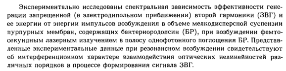 Экспериментально исследованы спектральная зависимость эффективности генерации запрещенной (в электродипольном приближении) второй гармоники (ЗВГ) и ее энергии от энергии импульсов возбуждения в объеме мелкодисперсной суспензии пурпурных мембран, содержащих бактериородопсин (БР), при возбуждении фемто-секундным лазерным излучением в полосу однофотонного поглощения БР. Представленные экспериментальные данные при резонансном возбуждении свидетельствуют об интерференционном характере взаимодействия оптических нелинейностей различных порядков в процессе формирования сигнала ЗВГ.