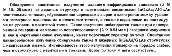 Обнаружено спонтанное излучение дальнего инфракрасного диапазона (Λ 9έ й 1О...20мкм) из диодных структур с вертикально связанными InGaAs/AlGaAs квантовыми точками, обусловленное переходами дырок и электронов между уровнями размерного квантования в квантовых точках, а также с переходами из континуума на уровень в квантовой точке. Такое излучение наблюдается только при одновременной генерации межзонного коротковолнового (λ 9ί 0.94 мкм) лазерного излучения и, как и коротковолновое излучение, имеет пороговый характер so току. Спонтанное длинноволновое излучение обнаружено также в лазерных InGaAs/GaAs структурах с квантовыми ямами. Интенсивность этого излучения примерно на порядок слабее, чем в структурах с квантовыми точками. Порог по току у него отсутствует.