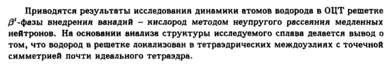 Приводятся результаты исследования динамики атомов водорода в ОЦТ решетке β'-фазы внедрения ванадий кислород методом неупругого рассеяния медленных нейтронов. На основании анализа структуры исследуемого сплава делается вывод о том, что водород в решетке локализован в тетраэдрических междоузлиях с точечной симметрией почти идеального тетраэдра.