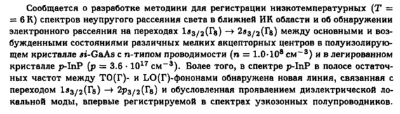 Сообщается о разработке методики для регистрации низкотемпературных (Т = = 6 К) спектров неупругого рассеяния света в ближней ИК области и об обнаружении электронного рассеяния на переходах 1в$/2(Гъ) 2в3/2(Г8) между основными и возбужденными состояниями различных мелких акцепторных центров в полуизолирующем кристалле si-GbAs с η-типом проводимости (п = 1.0-10® см~3) и в легированном кристалле р-1пР (р = 3.6 · 1017 см-3). Более того, в спектре p-ΙηΡ в полосе остаточных частот между ТО(Г)и ЬО(Г)-фононами обнаружена новая линия, связанная с переходом 1β3/2(Γβ) -> 2рз/2(Гв) и обусловленная проявлением диэлектрической локальной моды, впервые регистрируемой в спектрах узкозонных полупроводников.